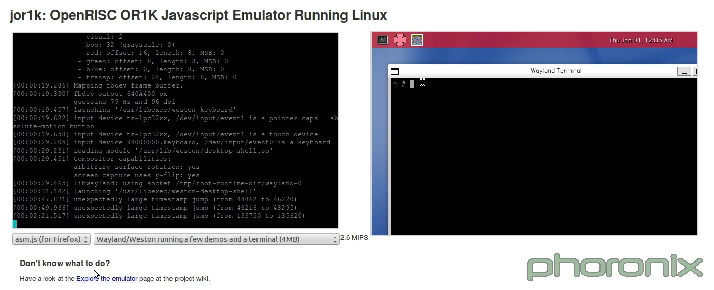 The jor1k is an interesting open-source toy emulator project to emulate a 32-bit OpenRISC OR1000 processor, 63MB of RAM, ocfb frame-buffer, and ATA-hard drive ... all in JavaScript. Though JavaScript based, there are asm.js optimizations and the performance seems to be quite decent in modern web browsers. The jor1k OpenRISC emulator can do a lot, even handle running the Linux kernel, GCC compiler, ScummVM Monkey Island, and the Wayland/Weston compositor, all from within the web browser.